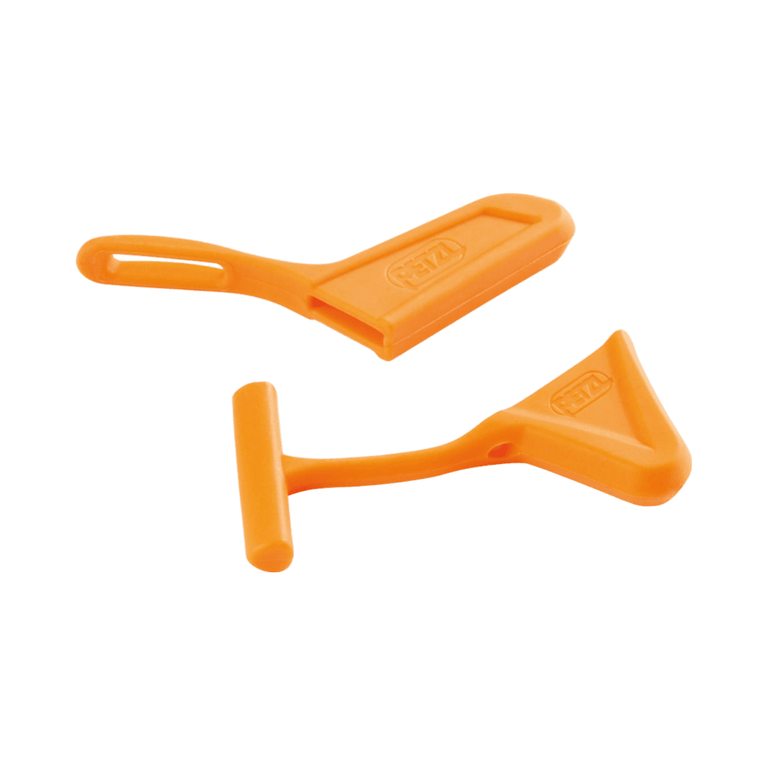 Bouchons de protection de la lame et de la pointe du piolet, imperdables et adaptables à la plupart des piolets Petzl.