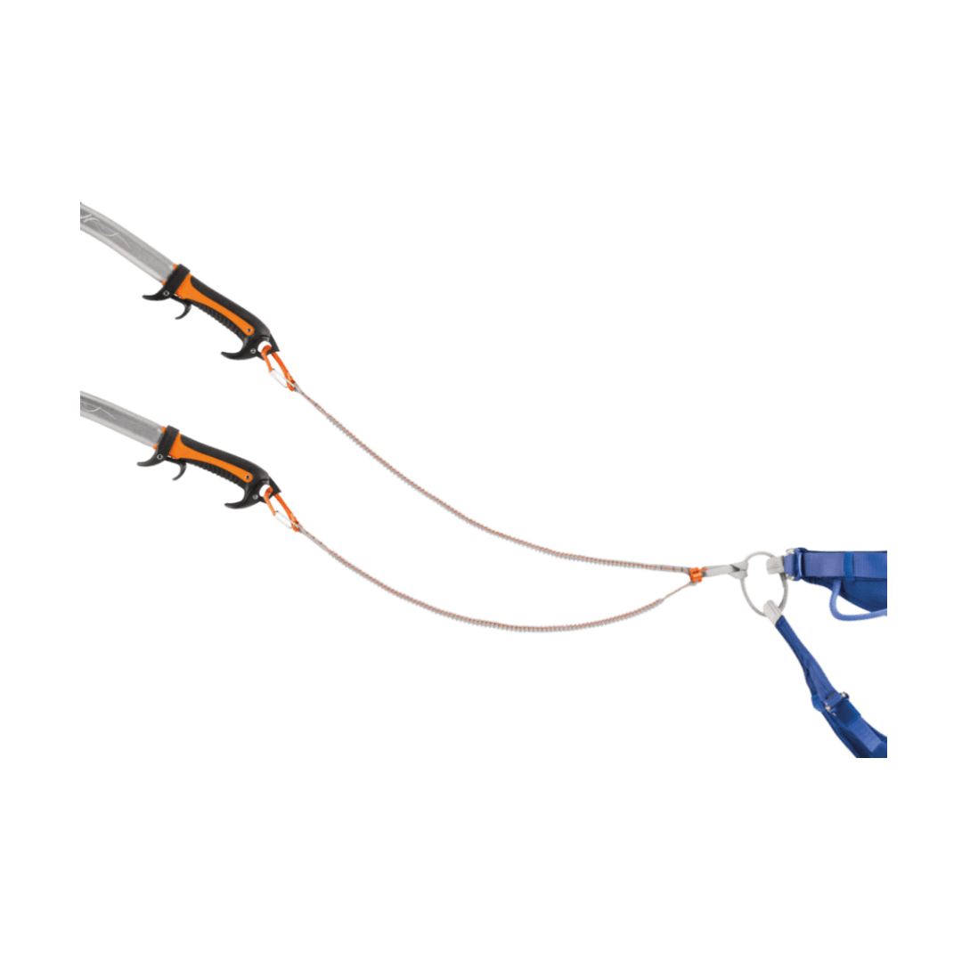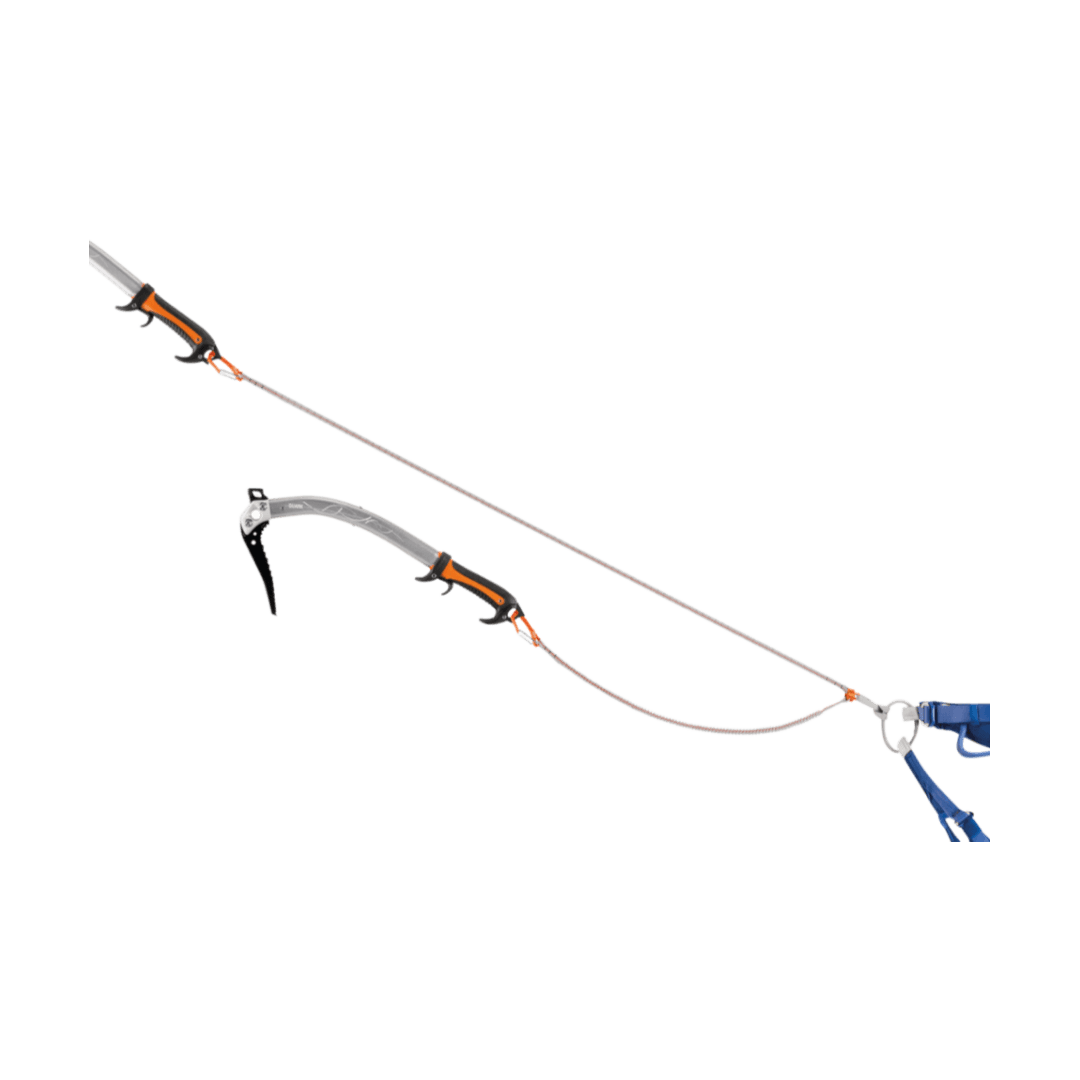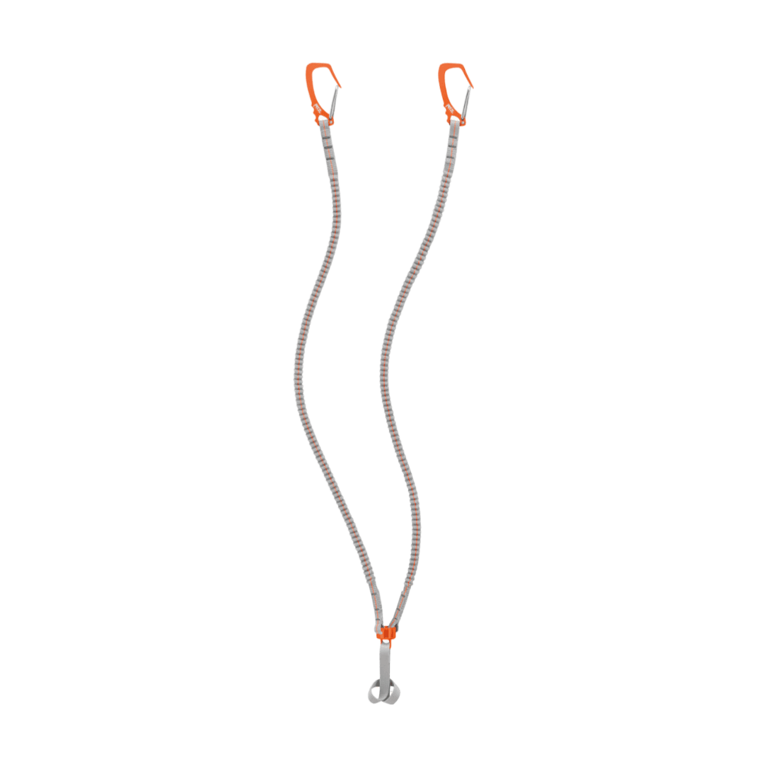 Sangle extensible permettant de connecter deux piolets techniques pour prévenir leur perte pendant l’escalade. Compacte et légère, cette sangle offre une grande capacité d’allongement et des connecteurs ergonomiques faciles à manipuler, même avec gants.